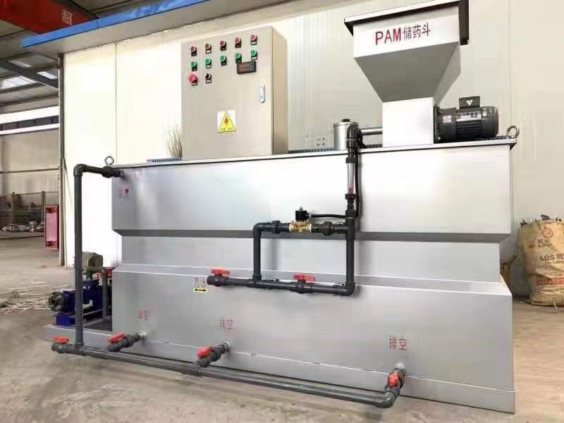 1.料斗中的粉狀藥劑經(jīng)定量供料裝置送入混合器中,與水進(jìn)行完全混合后進(jìn)入溶液箱中,混合液經(jīng)多級攪拌后形成均一濃度的溶液,最后進(jìn)入儲液箱內(nèi),經(jīng)計量泵投加至加藥點。